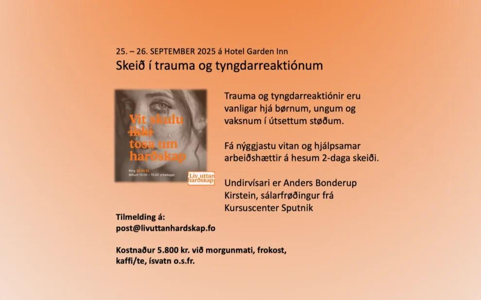 Skeið í trauma og tyngdarreaktiónum Trauma og tyngdarreaktiónir eru vanligar hjá børnum, ungum og vaksnum í útsettum støðum. Fá innlit…